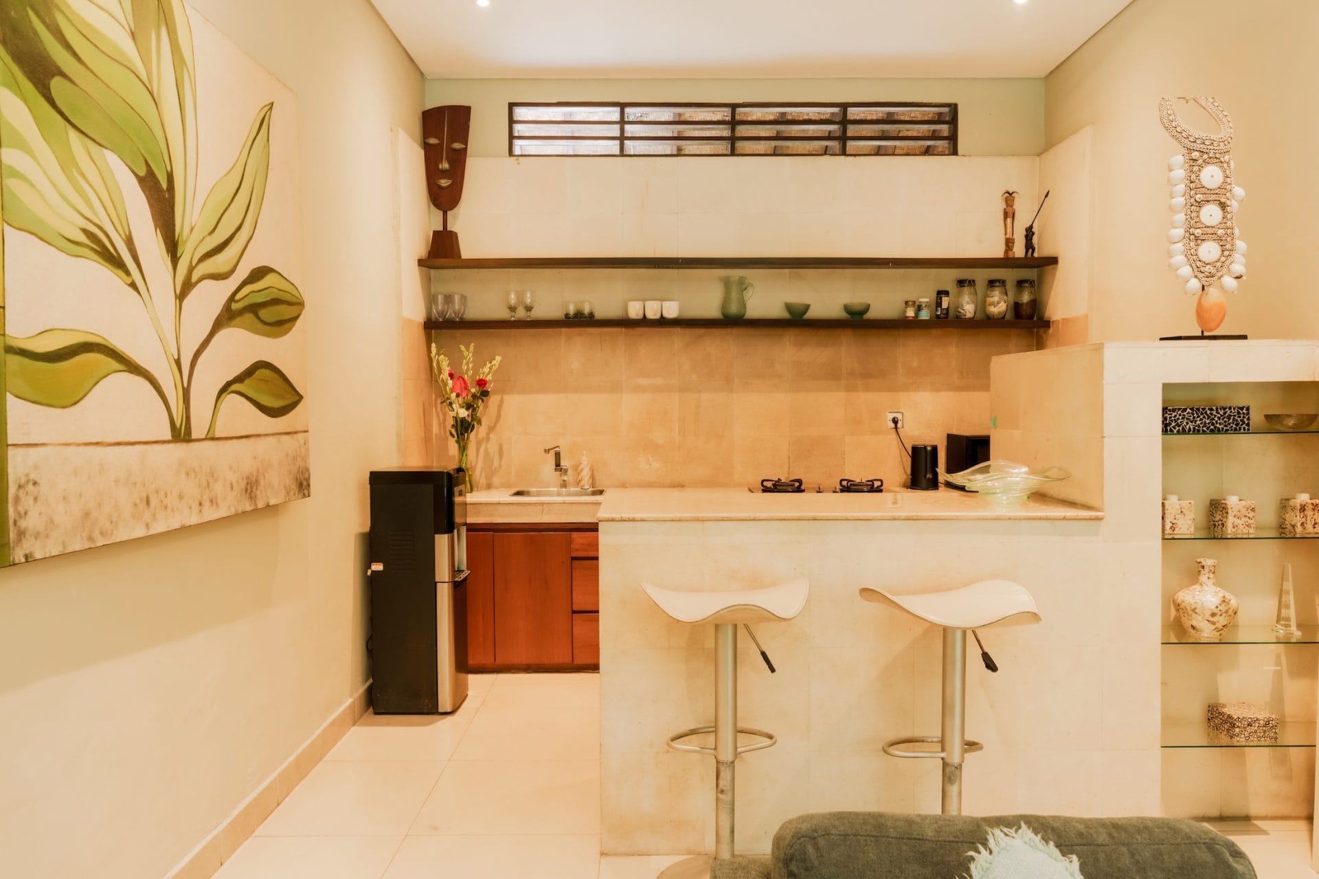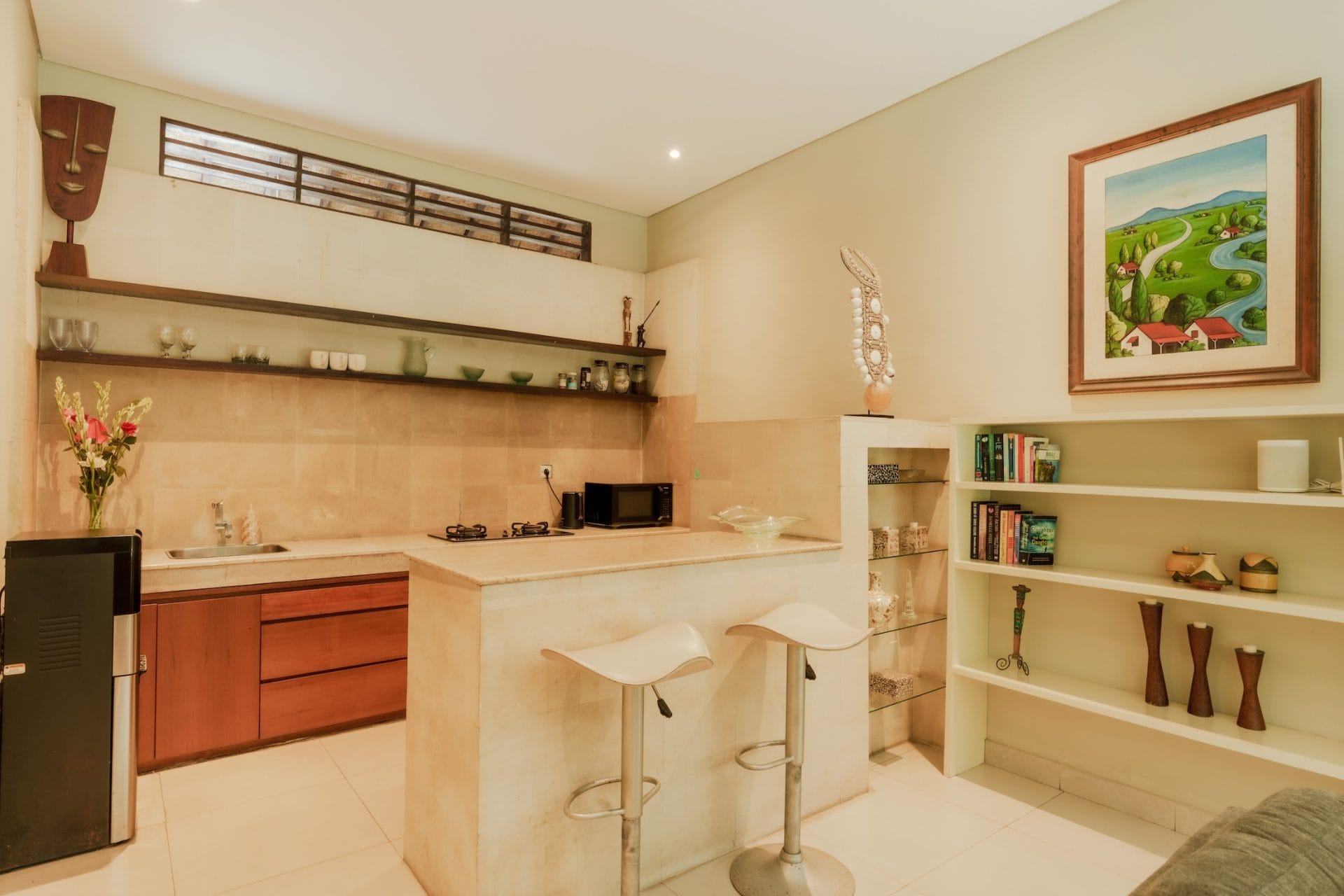 Lovingly maintained to preserve its traditional Balinese features, this much-loved villa combines rich timber and carved details with polished granite and marble finishes, creating a balance between island authenticity and contemporary style. Funky, colourful objets d’art and warm lighting bring personality and life to every corner, making it feel more like a tropical home than a holiday rental.