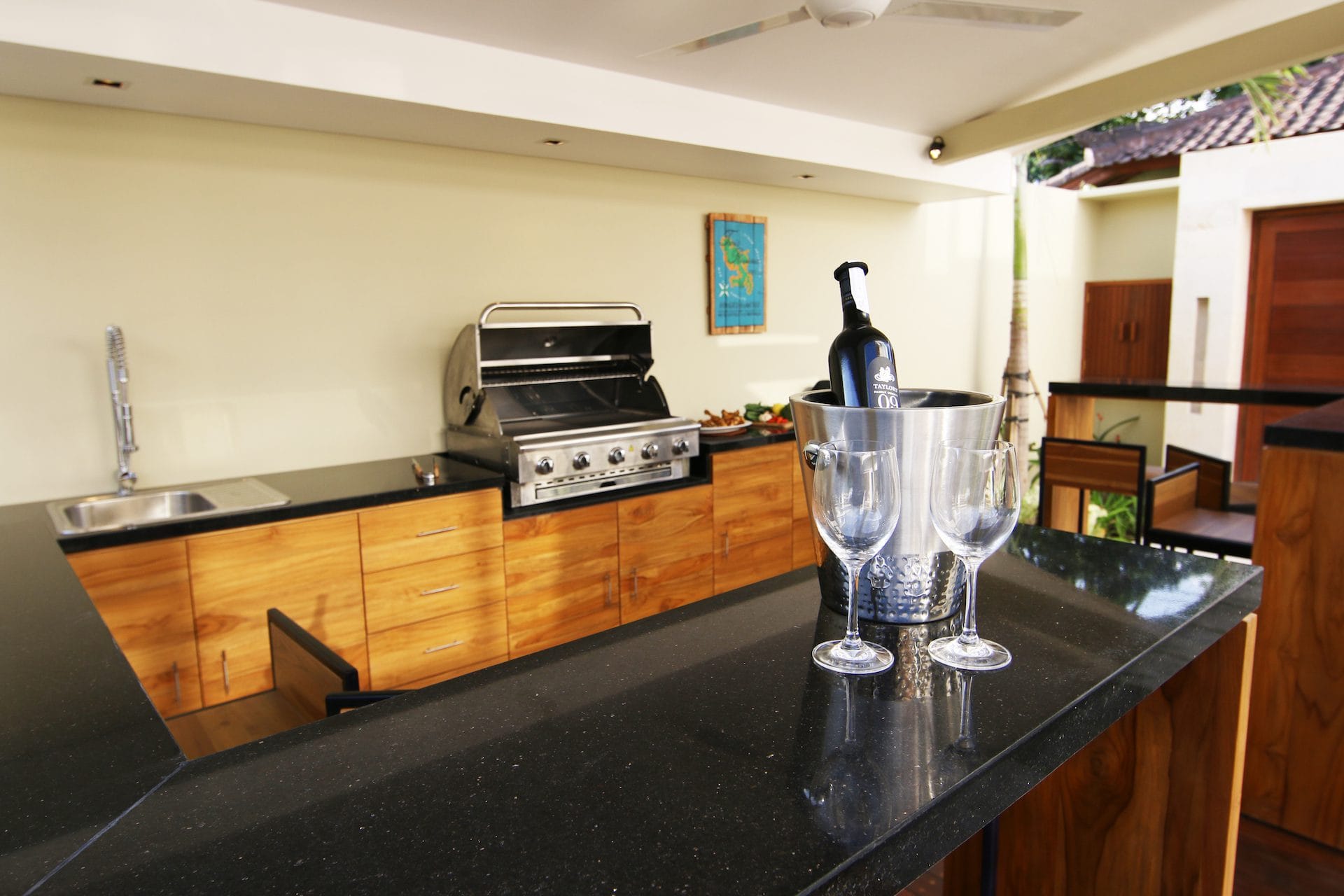 Each of Villa Aditi’s four king bedrooms features their own ensuite bathrooms, with elegant granite finishes, modern European fittings, and a master suite boasting a freestanding terrazzo bathtub. A fully equipped black-granite kitchen and outdoor BBQ area make dining at home as easy as stepping outside.